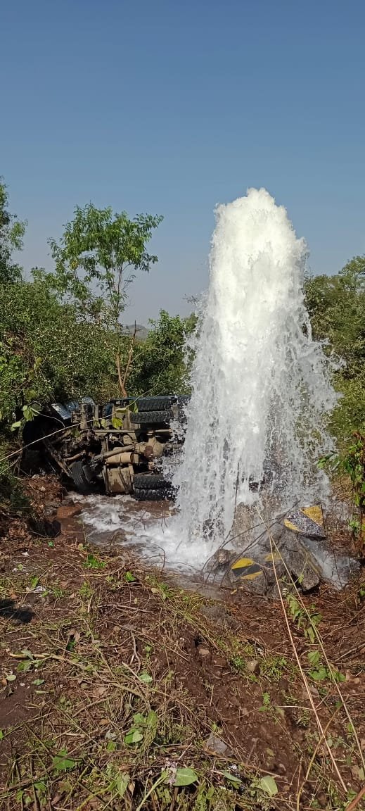 डंपरच्या धडकेने विद्युत पोलासह रस्त्याच्या उजव्या बाजूला असलेल्या हेटवणे जलवाहिनीची चावी तोडल्याने जलवाहिनीतील पाण्याचा 25 फुटाहून अधिक उंचावर फवारा उडून हजारो लिटर पाणी वाया गेले.