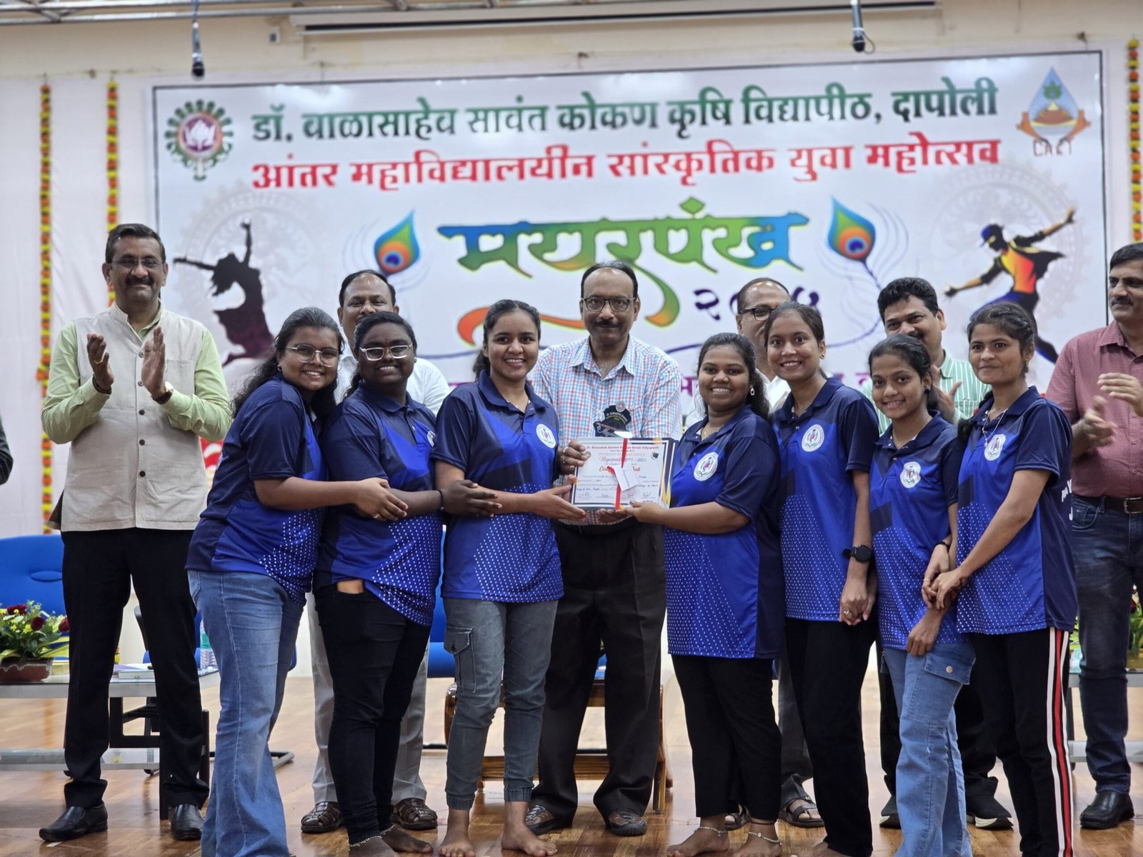 दिनांक १५ ते १७ ऑक्टोबर २०२५ या कालावधीत कृषी अभियांत्रिकी व तंत्रज्ञान महाविद्यालय, दापोली येथे आयोजित ‘मयूरपंख २०२५’ या सांस्कृतिक कार्यक्रमात या महाविद्यालयातील विद्यार्थिनींनी “लघु-नाटिका” या प्रकारात द्वितीय क्रमांक पटकावला.यामध्ये कु. गायत्री मांगडे, कु. मृणाल ठाकरे, कु. ऋतुजा साळुंखे, कु. श्रद्धा डावले,कु. आर्या गायकवाड , कु. आर्या कोठावळे या विद्यार्थिनी सहभाग घेतला होता. लघु-नाटिका” सादरीकरण करत असताना “आम्ही वेडे आहोत” या शीर्षकावर आधारित सादरीकरण केले.