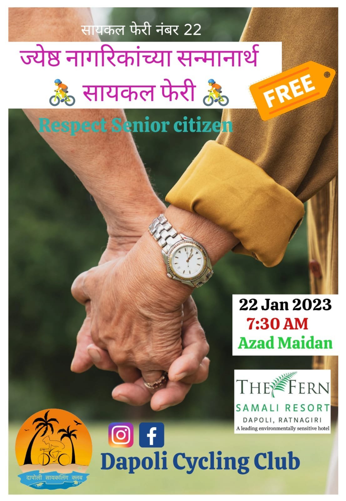 दापोली : वाढीच्या व विकासाच्या दृष्टीने माणसाच्या आयुष्याचे चार भाग पाडता येतात. बालपण, तारुण्य (तरुण वय), प्रौढत्व (प्रौढ वय) व वृद्धावस्था (म्हातारपण). घरातील वृद्ध व्यक्तींचा अनुभव नेहमी आपल्या कामी येतो, यामुळे वृद्धांचा सन्मान आदर झालाच पाहिजे. या जेष्ठ नागरिकांना मानाचा मुजरा करण्यासाठी दापोली सायकलिंग क्लब आणि द फर्न समाली रिसॉर्टतर्फे रविवारी २२ जानेवारी २०२३ रोजी सायकल फेरीचे आयोजन करण्यात आले आहे.
