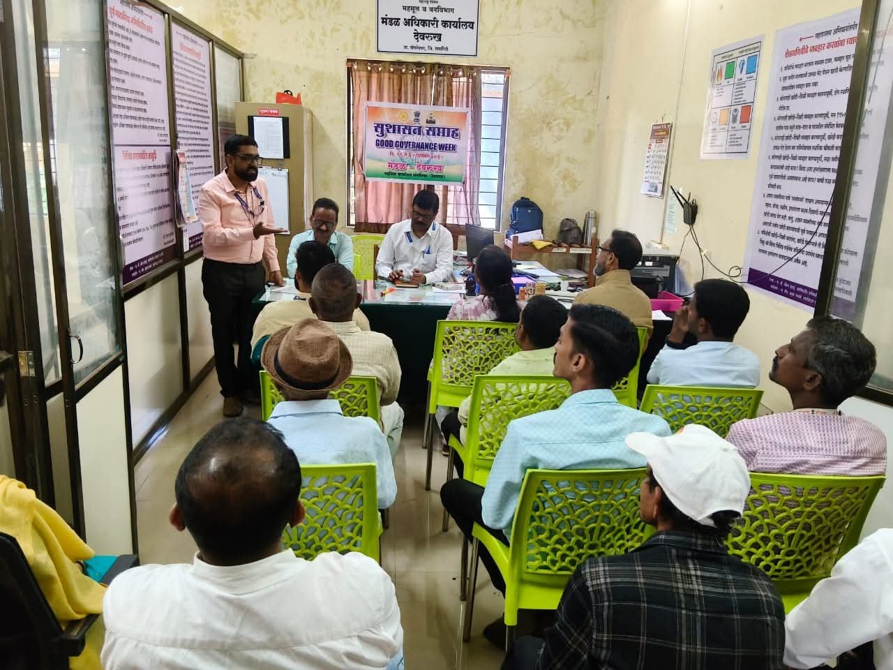 देवरुख : प्रशासकीय कामात पारदर्शकता आणि गतिमानता आणण्याच्या उद्देशाने, दिनांक १९ डिसेंबर २०२५ रोजी मंडळ अधिकारी कार्यालय देवरुख येथे ‘सुशासन सप्ताहा’चा (Good Governance Week) मोठ्या उत्साहात शुभारंभ करण्यात आला. या निमित्ताने महसूल विभागातील विविध अधिकारी आणि स्थानिक ग्रामस्थांच्या उपस्थितीत विशेष कार्यक्रमाचे आयोजन करण्यात आले होते.
