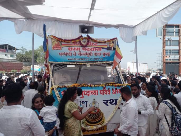 मुंबई : आंतरराष्ट्रीय बौद्ध भिक्खू संघ थायलंड येथील ११० भिक्खूंचा सहभाग असलेली तसेच तथागत गौतम बुद्ध यांच्या अस्थीधातु कलश घेऊन परभणी ते चैत्यभुमी अशी निघालेल्या देशातील पहिल्या बौद्ध धम्म पदयात्रेचा उद्या लाखोंच्या जनसमुदायाच्या उपस्थितीत दादर, चैत्यभूमी येथे समारोप होणार आहे. ही पदयात्रा ५७० किलोमीटर पायी चालत उद्या चैत्यभुमीवर पोचणार आहे.