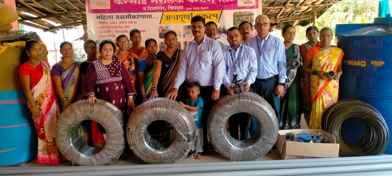 चिपळूण : जल व्यवस्थापन आणि वातावरणीय बदलाचा विचार करून कन्साई नेरोलॅक पेंट्स लि. या कंपनीतर्फे मांडवखरी( ता. चिपळूण ) येथील काळकीदेवी महिला शेतकरी गटाला ठिबक सिंचन यंत्रणेचे हस्तांतरण करण्यात आले. शेतीतून आर्थिक उन्नतीचा अन्नपूर्णा प्रकल्प गेल्या तीन वर्षापासून येथे यशस्वीपणे राबविण्यात येत असून शेती व शेतीपूरक व्यवसायाला यातून चालना देत आत्मनिर्भर ग्राम निर्मितीचे कार्य कंपनीने दिशान्तर संस्थेच्या साथीने महिला शेतकऱ्यांना सहकार्याचा हात देत साधले आहे.