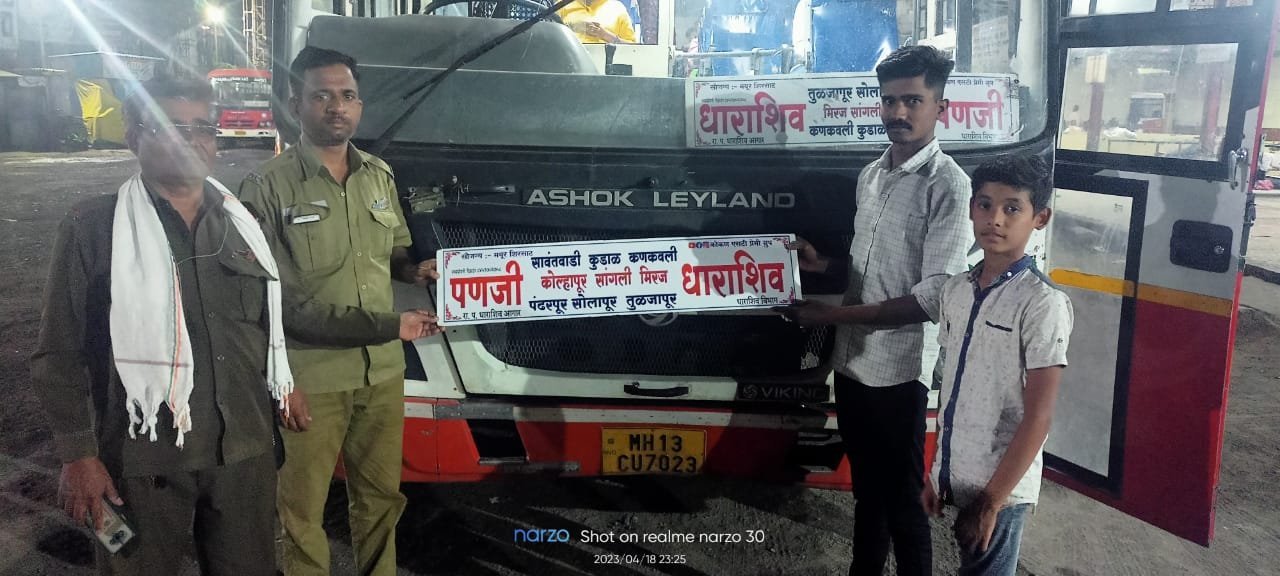 धाराशिव ते पणजी मार्गावर धावणाऱ्या बस सेवेसाठी मार्ग फलक देताना राज्य परिवहन महामंडळाच्या धाराशिव आगारचे चालक वाहक तसेच कोकण एसटी प्रेमी ग्रुपचे सदस्य मयूर शिरसाट उपस्थित होते.