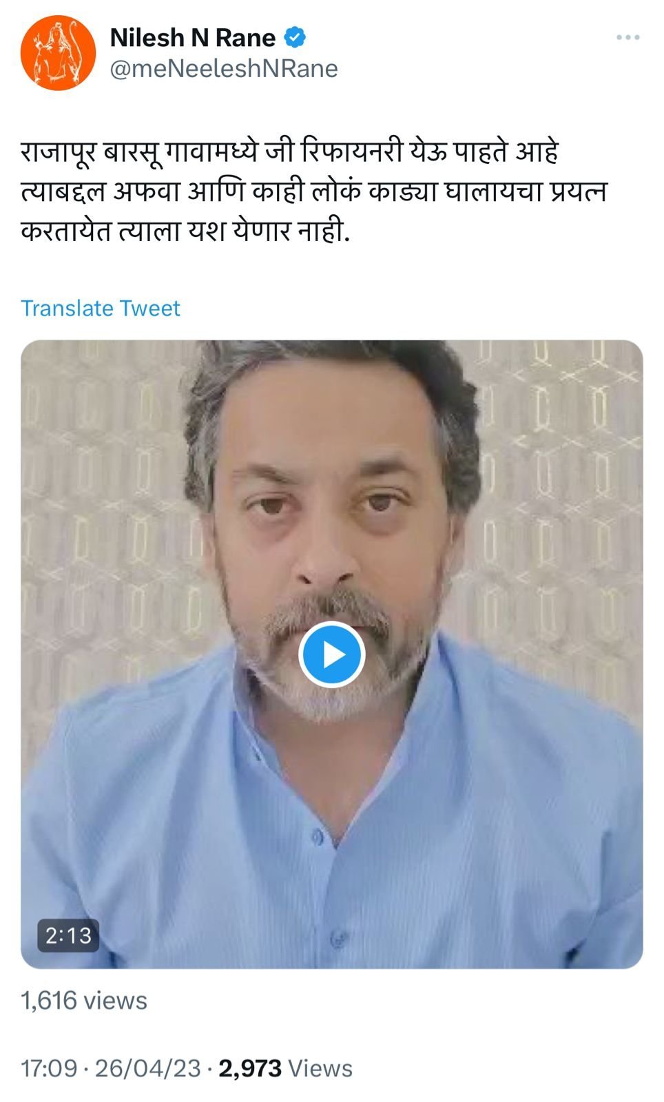 बारसू येथील प्रस्तावित रिफायनरीच्या माती परीक्षणाचे काम होत असताना प्रशासन आंदोलकांना समजावण्याचे काम करत आहे. त्यावेळी आग लावण्याचे, जनतेला भडकविण्याचे काम विनायक राऊत करत आहेत असा थेट आरोप निलेश राणे यांनी केला आहे. अफवा पसरविल्या जात आहेत. मात्र पालकमंत्री, प्रशासन ग्रामस्थांना समजाविण्याचे प्रयत्न करत आहेत. त्यातून हा प्रकल्प उभा करण्याचा आम्ही प्रयत्न करत असून त्याला लवकरात लवकर दिशा मिळेल असेही निलेश राणे म्हणाले. विनायक राऊत यांच्या कोणत्याच प्रयत्नांना आम्ही यश येऊ देणार नाही असा स्पष्ट इशारा निलेश राणे यांनी दिला आहे.