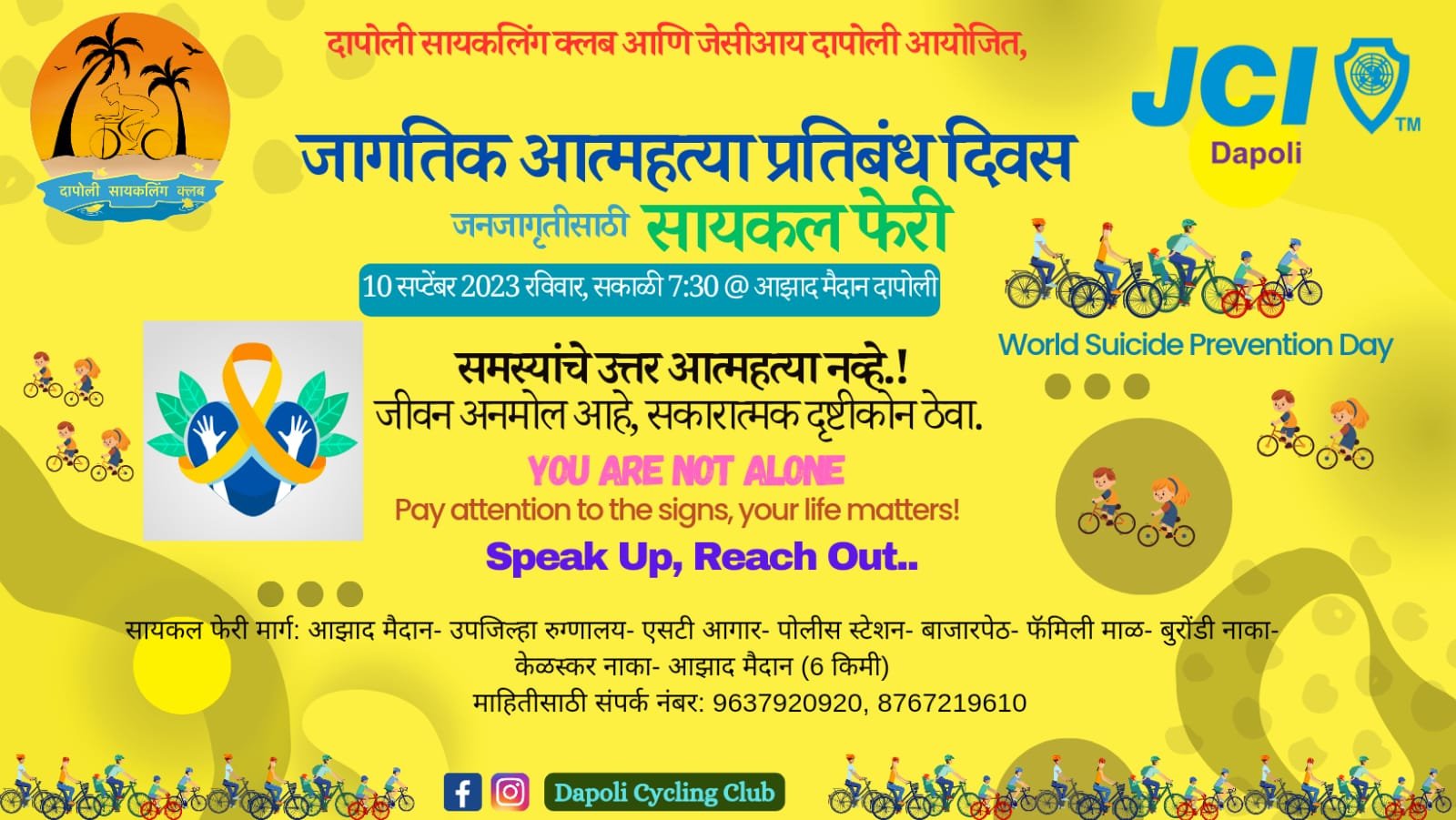 ही सायकल फेरी आझाद मैदान दापोली येथून सकाळी ७:३० वाजता सुरु होईल. ती उपजिल्हा रुग्णालय, एसटी आगार, पोलीस स्टेशन, बाजारपेठ, फॅमिली माळ, बुरोंडी नाका, केळस्कर नाका, आझाद मैदान अशा ६ किमी मार्गावर असेल. समारोप आझाद मैदानात सकाळी ९:३० वाजता होईल. या सायकल फेरी दरम्यान आत्महत्येबद्दल जागरुकता आणि ती रोखण्यासाठीचे प्रयत्न याविषयक तज्ज्ञ जाणकारांचे माहितीपूर्ण सेशन होतील.