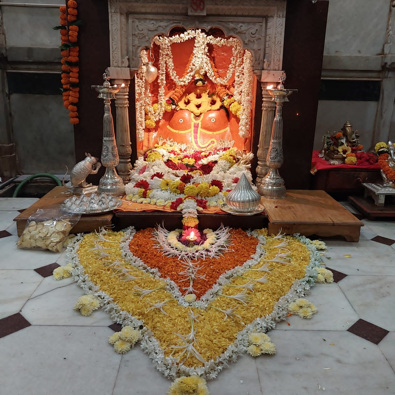 सोमवारी संकष्टी चतुर्थीनिमित्त मुख्य पुजारी अभिजीत घनवटकर तसेच त्यांच्या सहकाऱ्यांनी रंगीबेरंगी फुलांची केलेली आरास पाहून भाविकांनी प्रशंसा केली. दर्शनासाठी आलेल्या अनेकांनी बाप्पाचे हे सजवलेलं रुप आपल्या मोबाईल कॅमेऱ्यात बंदिस्त केले.
