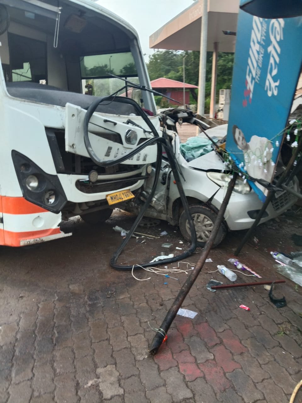 आरवली येथे मिनी बसने उभ्या कारला चिरडले; दोन चिमुकल्यांसह चार जखमी