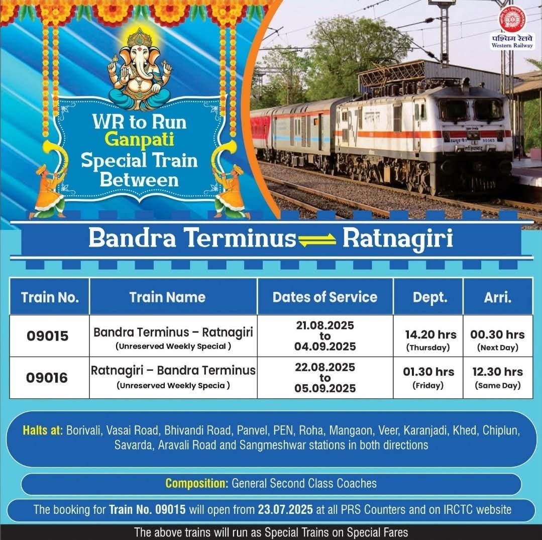 Konkan Railway | बांद्रा- रत्नागिरी गणपती स्पेशल ट्रेनचे आरक्षण उद्यापासून सुरु