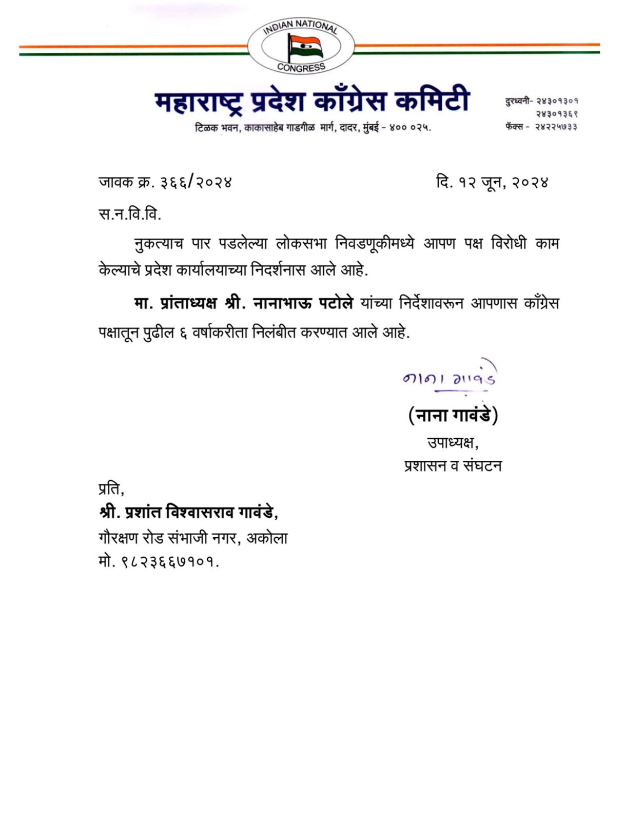 प्रदेश काँग्रेसचे सचिव प्रशांत गावंडे पक्षातून सहा वर्षांसाठी निलंबित