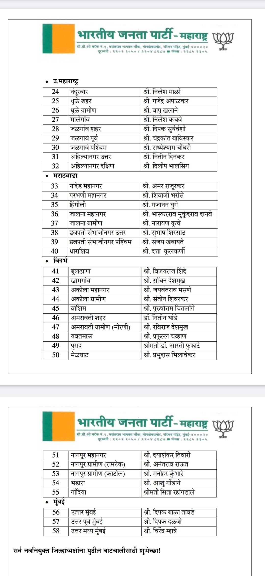 मुंबई, 13 मे 2025 : भारतीय जनता पार्टीच्या महाराष्ट्रातील संघटनात्मक 58 जिल्ह्यांकरिता जिल्हाध्यक्षांच्या नावांची घोषणा मंगळवारी करण्यात आली…