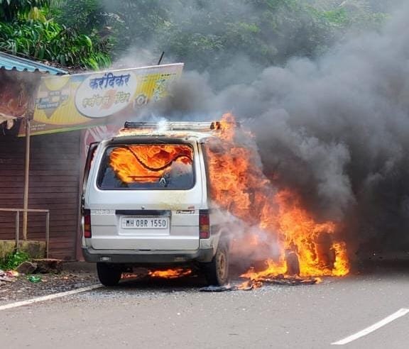 पावस येथे गजबजलेल्या रस्त्यावर मारुती व्हॅन पेटली