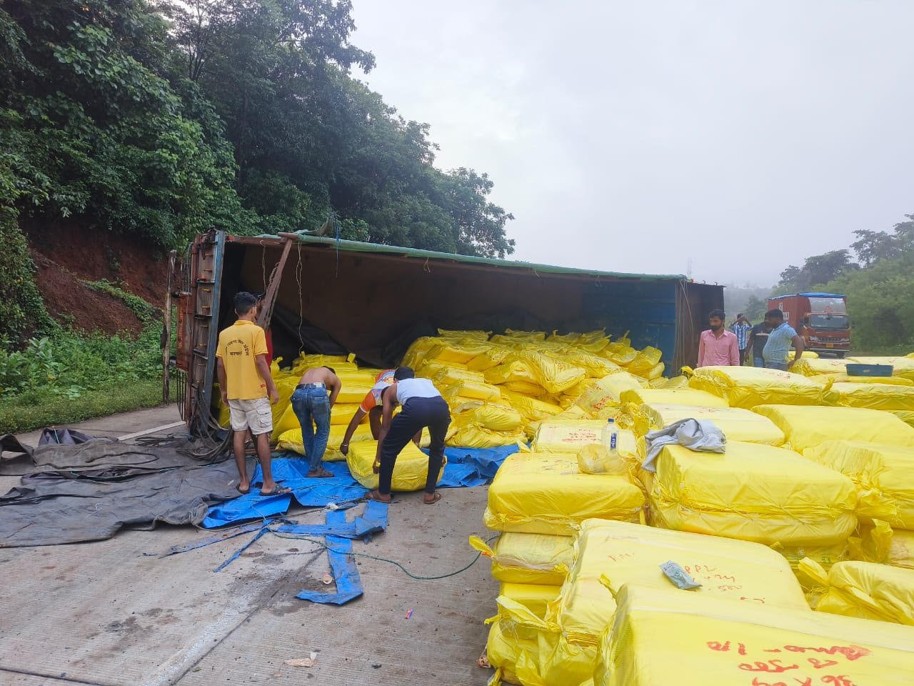 मुंबई-गोवा महामार्गावर खताची वाहतूक करणारा कंटेनर उलटला