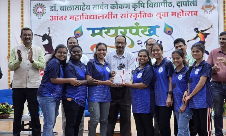 दापोली : डॉ. बाळासाहेब सावंत कोकण कृषी विद्यापीठ, दापोली आयोजित आंतर महाविद्यालयीन सांस्कृतिक युवा महोत्सव ‘मयूरपंख २०२५’ मध्ये कृषीभूषण डॉ. तानाजीराव चोरगे शिक्षण व संशोधन संस्था संचलित जिजामाता महिला कृषी महाविद्यालय मांडकी-पालवण च्या विद्यार्थिनींनी लघु-नाटिका सांस्कृतिक या प्रकारामध्ये घवघवीत यश संपादन केले आहे.