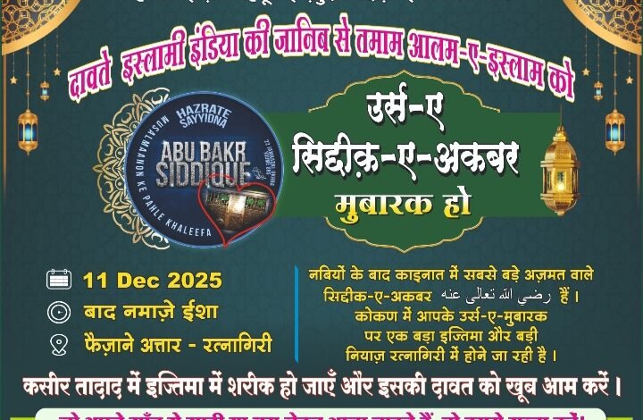 रत्नागिरी : दावते इस्लामी (Dawat-e-Islami) शाखा रत्नागिरी यांच्या वतीने कोकणनगर, फैजाने अत्तार (Faizan-e-Attar) येथे भव्य तालुकास्तरीय इज्तिमा (Taluka Level Ijtima) चे आयोजन करण्यात आले आहे. सिद्दीकी ए अकबर यांच्या उर्स शरीफ निमित्ताने आयोजित हा धार्मिक कार्यक्रम ११ डिसेंबर रोजी रात्री ९ वाजता सुरू होणार आहे.