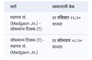 विशेष गाडी क्र. १: ०१००४ / ०१००३ मडगाव जं. – लोकमान्य टिळक (T) – मडगाव जं. साप्ताहिक स्पेशल. 5, 12 आणि 19 ऑक्टोबर 2025 रोजी