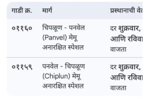 विशेष गाडी क्र. २: ०११६० / ०११५९ चिपळूण – पनवेल – चिपळूण मेमू अनारक्षित स्पेशल. ( 3 ऑक्टोबर ते 26 ऑक्टोबर 2025 या कालावधीत आठवड्यातील दर शुक्रवार, शनिवार व रविवारी धावेल )