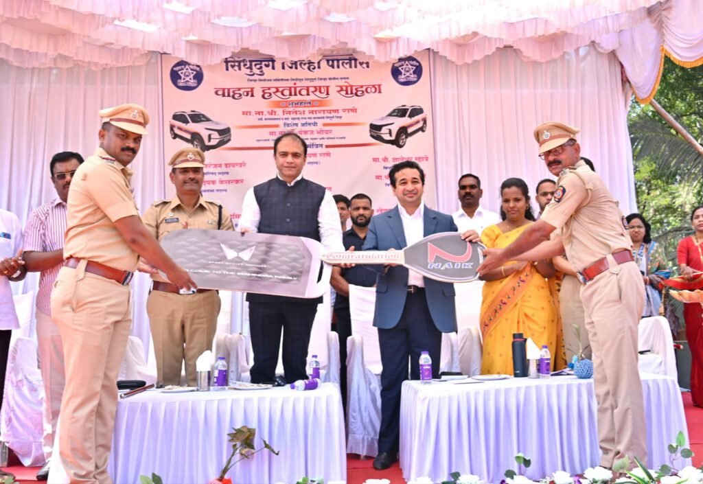 सिंधुदुर्ग : सिंधुदुर्ग जिल्हा नियोजन समितीच्या निधीतून जिल्हा पोलीस दलास प्राप्त झालेल्या नवीन वाहनांचा हस्तांतरण सोहळा गुरुवारी १९ मार्च २०२६ रोजी झाला. पोलीस मुख्यालय येथील पोलीस कवायत मैदानावर सकाळी १० वाजता हा कार्यक्रम पार पडला. या सोहळ्याचे उद्घाटन राज्याचे मत्स्यव्यवसाय व बंदरे विकास मंत्री तथा सिंधुदुर्गचे पालकमंत्री ना. नितेश राणे यांच्या शुभहस्ते व गृहराज्यमंत्री (ग्रामीण) ना. डॉ. पंकज भोयर यांच्या उपस्थितीत करण्यात आले.